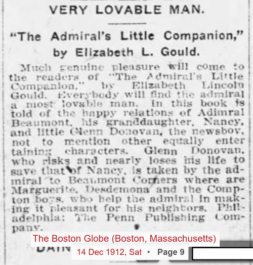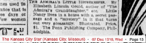 |   | THE ADMIRAL'S GRANDDAUGHTER -- illustrated by Wuanita Smith. 1907. Penn. THE ADMIRAL'S LITTLE HOUSEKEEPER -- "The Beaumont family invites all the relatives to their house for a Christmas celebration." -- illustrated by Wuanita Smith. 1910. Penn. THE ADMIRAL'S LITTLE SECRETARY -- illustrated by Wuanita Smith. 1911, 1914. Penn. THE ADMIRAL'S LITTLE COMPANION -- 1912. Penn. |