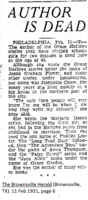 and reprinted by Saalfield. The "High School Girls" series follows the high school career of courageous, athletic Grace Harlowe and her friends -- kind-hearted, quick-tempered Nora, loyal Jessica, and intelligent Anne Pierson, who is continually harassed by her ne'r-do-well father; along with four boys, the group comprises the "Eight Originals". Later, other girls and boys are added to the group: two "enemy" girls who repent and become Grace's friends, a young orphan who is taken up by the group, etc. The College series follows Grace, Anne, and Miriam as they go off to Overton College; after college, Grace stays at Overton, getting a job managing a boarding house for needy girls. Several new characters are introduced -- Emma Dean, J. Elfreda Briggs, etc. -- who continue throughout the later series. In a typical High School or College volume, a trouble-making girl who is jealous of Grace is eventually "converted" and becomes her friend, or a plucky orphan girl is restored to her long lost parents. The Overseas books follow Grace's adventures as an ambulance driver in WW I; I haven't read any of these, so I can't comment on them. The Overland Riders books are gunslinging Westerns -- Grace and her friends Nora and Hippy (now married), J. Elfreda (now a lawyer) and Emma (inexplicably, she has become a mystic cult-of-the-month devotee), joined occasionally by Grace's now-husband Tom Gray and others -- roam around with pistols and lassos, battling rustlers, border thieves, claim-jumpers, and moonshiners. This series seems much more formulaic and less well-written than the other three. In a unique bit of cross-series marketing on Altemus' part, Grace and Co. make a guest appearance in at least one of the Meadow-brook Girls books, another Altemus series. Supposedly, Hippy Wingate, who later marries Grace's friend Nora, is the cousin of Meadow-brook girl Tommy Thompson. Additionally, one of the Pony Rider Boys turns out to be another of Hippy's cousins, and he is featured as a main character in several of the Overland Riders books. Madge Morton pops up in one of the College series, as well. Many, if not all, of these series were penned by the prolific Josephine Chase.  | HIGH SCHOOL GIRL SERIES GRACE HARLOWE'S PLEBE YEAR AT HIGH SCHOOL; or, The Merry Doings of the Freshman Girls -- 1910. Altemus; Goldsmith. GRACE HARLOWE'S SOPHOMORE YEAR IN HIGH SCHOOL; or The Record of the Girl Chums in Word and Athletics -- 1911. Altemus; Goldsmith; Donohue. GRACE HARLOWE'S JUNIOR YEAR AT HIGH SCHOOL; or, Fast Friends in the Sororities -- 1911. Altemus; Goldsmith. GRACE HARLOWE'S SENIOR YEAR AT HIGH SCHOOL; or, The Parting of the Ways -- 1911. Altemus; Goldsmith. Read it online! COLLEGE GIRL SERIES GRACE HARLOWE'S FIRST YEAR AT OVERTON COLLEGE -- 1914. Altemus. GRACE HARLOWE'S SECOND YEAR AT OVERTON COLLEGE -- 1914. Altemus; Donohue. GRACE HARLOWE'S THIRD YEAR AT OVERTON COLLEGE -- 1914. Altemus GRACE HARLOWE'S FOURTH YEAR AT OVERTON COLLEGE -- 1914. Altemus GRACE HARLOWE'S RETURN TO OVERTON CAMPUS -- 1915. Altemus. GRACE HARLOWE'S PROBLEM -- 1916. Altemus; Donohue. GRACE HARLOWE'S GOLDEN SUMMER -- 1917. Altemus. OVERSEAS SERIES GRACE HARLOWE OVERSEAS -- 1920. Altemus. GRACE HARLOWE WITH THE RED CROSS IN FRANCE -- 1920. Altemus. GRACE HARLOWE WITH THE MARINES AT CHATEAU THIERRY -- 1920. Altemus. GRACE HARLOWE WITH THE U.S. TROOPS IN THE ARGONNE -- 1920. Altemus. GRACE HARLOWE WITH THE YANKEE SHOCK BOYS AT ST. QUENTIN -- 1920. Altemus. GRACE HARLOWE WITH THE AMERICAN ARMY ON THE RHINE -- 1920. Altemus. OVERLAND RIDERS SERIES GRACE HARLOWE'S OVERLAND RIDERS ON THE GREAT AMERICAN DESERT -- 1921. Altemus; Saalfield. Read it online! GRACE HARLOWE'S OVERLAND RIDERS ON THE OLD APACHE TRAIL -- 1921. Altemus; Saalfield. GRACE HARLOWE'S OVERLAND RIDERS AMONG THE KENTUCKY MOUNTAINEERS -- 1921. Altemus; Saalfield. GRACE HARLOWE'S OVERLAND RIDERS IN THE GREAT NORTH WOODS -- 1921. Altemus; Saalfield. GRACE HARLOWE'S OVERLAND RIDERS IN THE HIGH SIERRAS -- 1923. Altemus; Saalfield. GRACE HARLOWE'S OVERLAND RIDERS IN THE YELLOWSTONE NATIONAL PARK -- 1923. Altemus; Saalfield. GRACE HARLOWE'S OVERLAND RIDERS IN THE BLACK HILLS -- 1923. Altemus; Saalfield. GRACE HARLOWE'S OVERLAND RIDERS AT CIRCLE O RANCH -- "On a trip to a California ranch, Grace Harlowe and her Overland Riders pursue cattle rustlers." -- 1923. Altemus; Saalfield. GRACE HARLOWE'S OVERLAND RIDERS AMONG THE BORDER GUERILLAS -- 1924. Altemus; Saalfield. GRACE HARLOWE'S OVERLAND RIDERS ON THE LOST RIVER TRAIL -- "Searching for a legendary river, Grace Harlowe and her Overland Riders battle bandits and a fire in an Indian village." -- 1924. Altemus. |